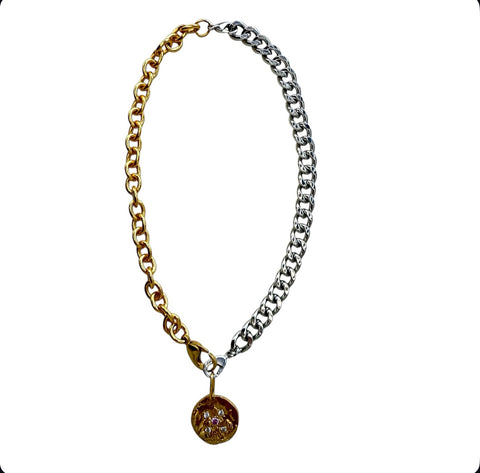 This necklace features a striking half-and-half mixed-metal design: one side crafted from warm gold-toned round links, the other from cool silver-toned links. The two contrasting chains meet at a central junction where a hammered, organic-style gold pendant hangs. The pendant includes small gemstone accents arranged in a star-like pattern, adding a subtle hint of sparkle. The overall design blends modern asymmetry with artisanal charm, making it a bold statement piece.