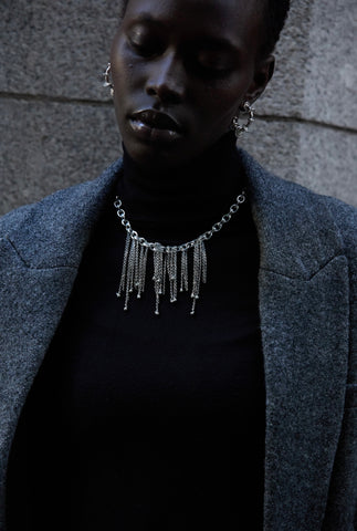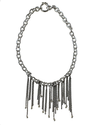 Make a statement with this striking silver-tone chain necklace featuring dramatic cascading fringe. The design pairs a chunky, polished link chain with multiple dark silver dangling chain strands, each tipped with small metallic bead accents for added movement and shine. Edgy yet elegant, this necklace adds texture and attitude to any outfit—perfect for elevating everyday looks or complementing evening wear.