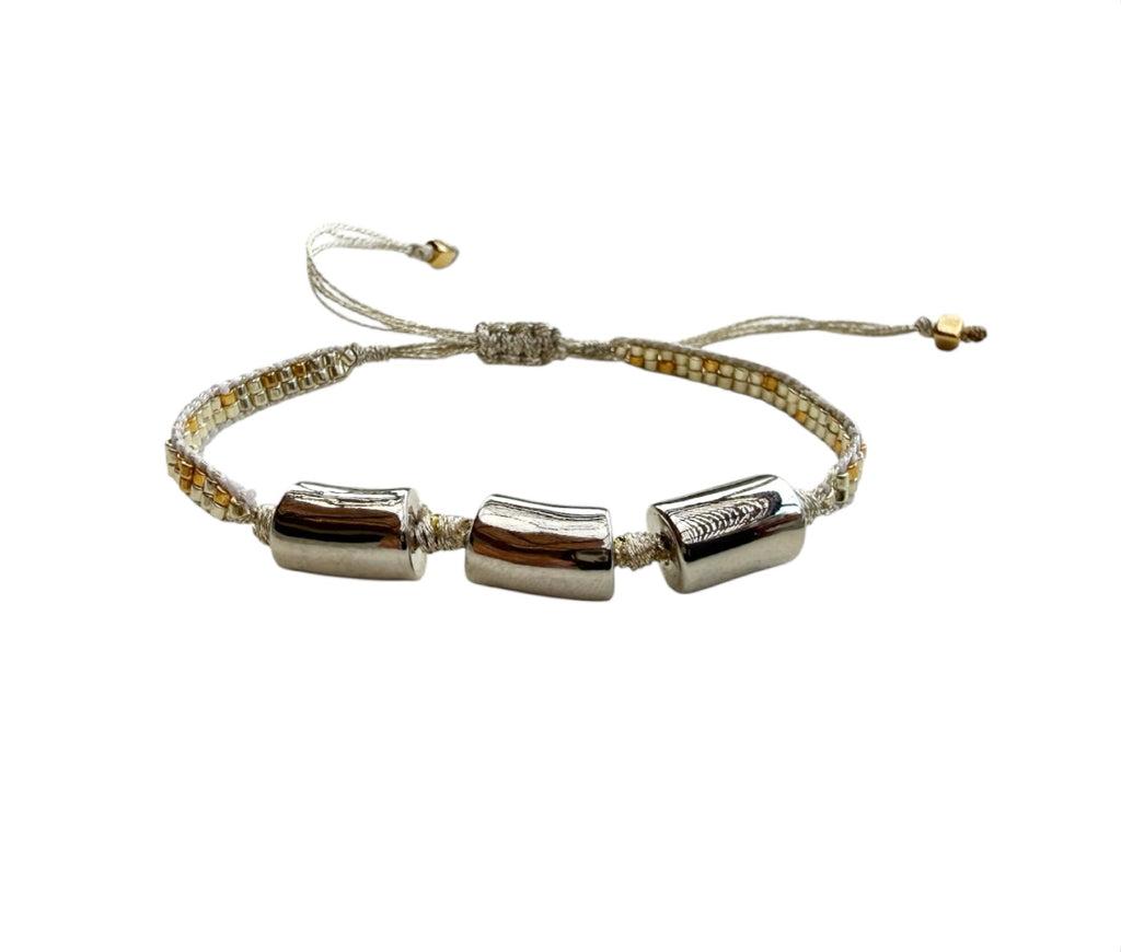 A sleek balance of craftsmanship and contemporary design, this bracelet features a hand-woven band accented with three polished silver-toned cylinders. The subtle shimmer of the threads and the sculptural weight of the metal create a piece that feels both refined and effortlessly modern.