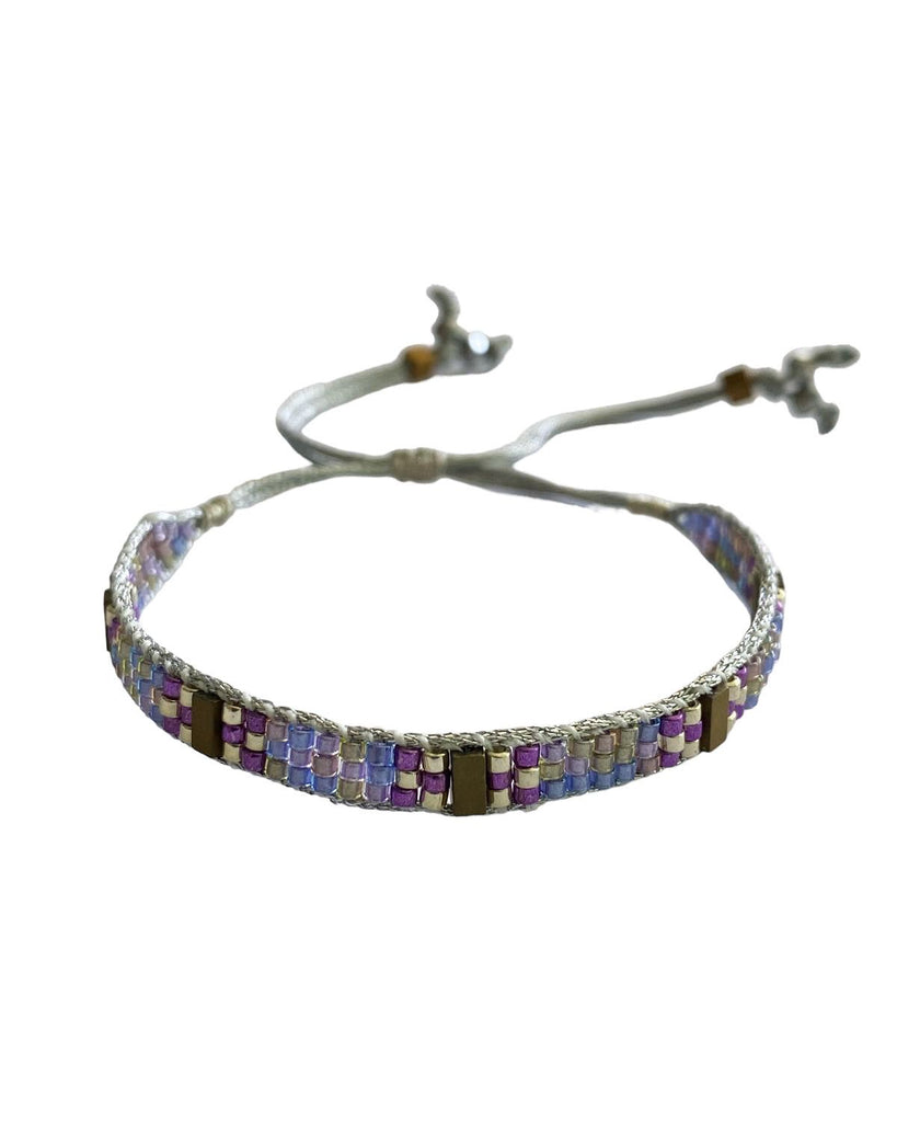 The Kiki Bracelet is a marvelous creation that features a perfect combination of iridescent colorful Miyuki beads and gold-plated cubes, forming a magnificent and hypnotic effect. The pull-tie closure adds convenience and ensures a comfortable fit, while the finishing touch of Murano crystals enhances the bracelet's overall beauty. This accessory showcases a harmonious blend of colors and textures, making the Kiki Bracelet a captivating piece that elevates your style with elegance and flair.
