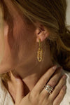 These hoops make a bold statement with their unique design. These earrings feature a golden-plated chain adorned with pearls, creating a one-of-a-kind drop.